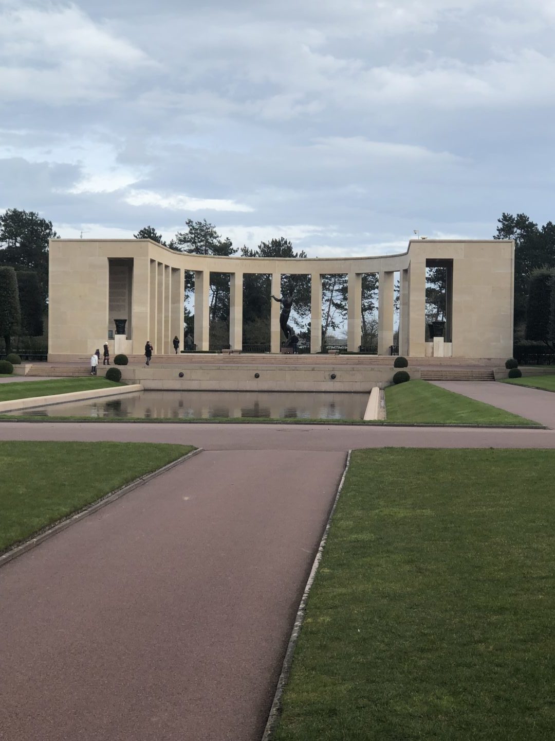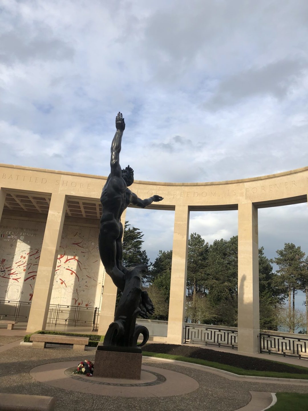 We “had a wonder” through the cemetery hearing different stories of our fallen heroes lives. First, Duncan had told us that the cemetery was well cared for by very proud grounds keepers. In fact there was one shrub, bush, or plant from every state in the USA. We also learned that the cemetery had trees with no points, and that it was done on purpose. They were cut to be flat tops to symbolize the tombs of the pharaohs in ancient Egypt. Th pharaohs’ tombs had a flat top, and so that is what the grounds keepers did for the brave men (and 4 women) who died fighting in the Battle of Normandy. Second, Duncan had told us that every head stone (either Latin crosses or star of Davids) was facing west. The direction of the United States of America, and at the end of this cemetery there were gates guarded by angels to assure the brave ones’ safe passage home. Walking through the hallowed ground that holds so many of our fallen heroes definitely puts the Second World War in perspective. The United Stated played a major role in this war, and the American presence is still very much there.