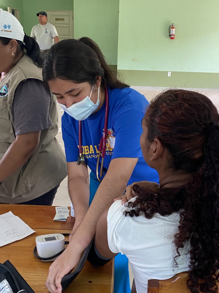 At the health station we collected basic information and measured blood pressure, temperature, and glucose levels. After completing the screenings, community members moved to the donations table where Perly and Laura shared a pamphlet about mental health in connection with physical wellbeing. The information was presented in a culturally sensitive way, since discussions about mental health are often better received when framed as overall wellbeing rather than strictly as mental illness. Each person was also given items such as soap, toothbrushes, toothpaste, medications, children’s vitamins, and other helpful supplies.
